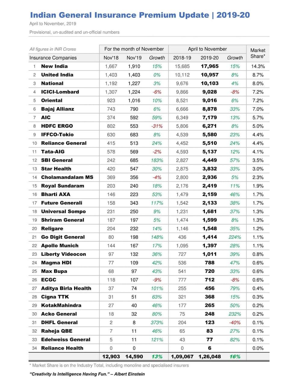 Non-life Insurance Industry flash figures for and upto the month of November 2019-20