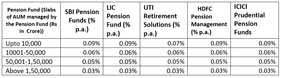 According to the PFRDA circular, "The Investment Management Fees (IMF) to be charged by the Pension Fund will be on the aggregate AUM of the Pension Fund under all schemes managed by Pension Funds. Also, the Pension Fund will continue to load their charges (investment management fees) onto the net asset value on daily basis."